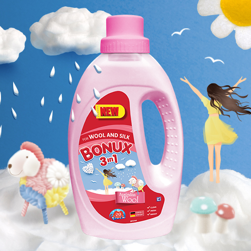 Дълбоко изпира и се грижи за деликатните дрехи от вълна или коприна, превръщайки ги в ароматни облачета. Bonux 3в1 Australian Wool е течен перилен препарат, специално създаден за нежно почистване на вашите деликатни вълнени или копринени дрехи. Тъй като не съдържа почистващи ензими, течният препарат Bonux 3в1 Australian Wool за вълна или коприна с формула, разработена в Германия, защитава тези деликатни протеинови влакна, за да им се радвате по-дълго.