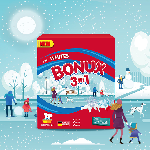 Изпира в дълбочина и освежава белите дрехи, обгръщайки ги със свежестта на слънчев зимен ден. Bonux 3в1 Polar Ice Fresh е перилен препарат, специално създаден за тези, които искат безпроблемно да перат бели дрехи. При каква температура се изпира бялото пране? Бялото пране може да се пере и при високи температури, стига материята да го позволява. Но защо да перете при висока температура? С новата, подобрена формула на перилния препарат Bonux 3в1, разработена в Германия, можете, с максимална ефективност, да перете белите дрехи и при ниски температури.