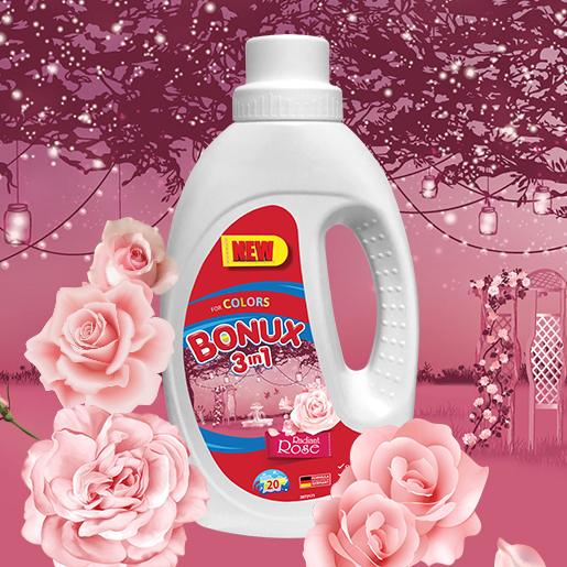 Безупречно изпира цветните дрехи и оставя в тях свежия, приказен аромат на рози. Bonux 3в1 Radiant Rose в течен вид е висококачествен, нежен към тъканите препарат за цветно пране, създаден за най-претенциозните купувачи. Новата му подобрена формула, разработена в Германия, и ароматите, вдъхновени от природата, се грижат за дрехите ви точно по желания от вас начин.