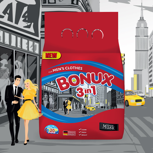 Изпира в дълбочина и се грижи за мъжките дрехи лесно и ефективно, докато дискретният мускусен аромат създава усещане за елегантност и загадъчност. Bonux 3в1 Vibrant Musk е препарат за пране на мъжки дрехи, с увеличена ефективност. Подобрената му формула с мъжки аромат, разработена в Германия, внимателно отстранява замърсяванията и неприятните миризми от цигари и пот от мъжките дрехи, оставяйки ги чисти и дискретно парфюмирани.